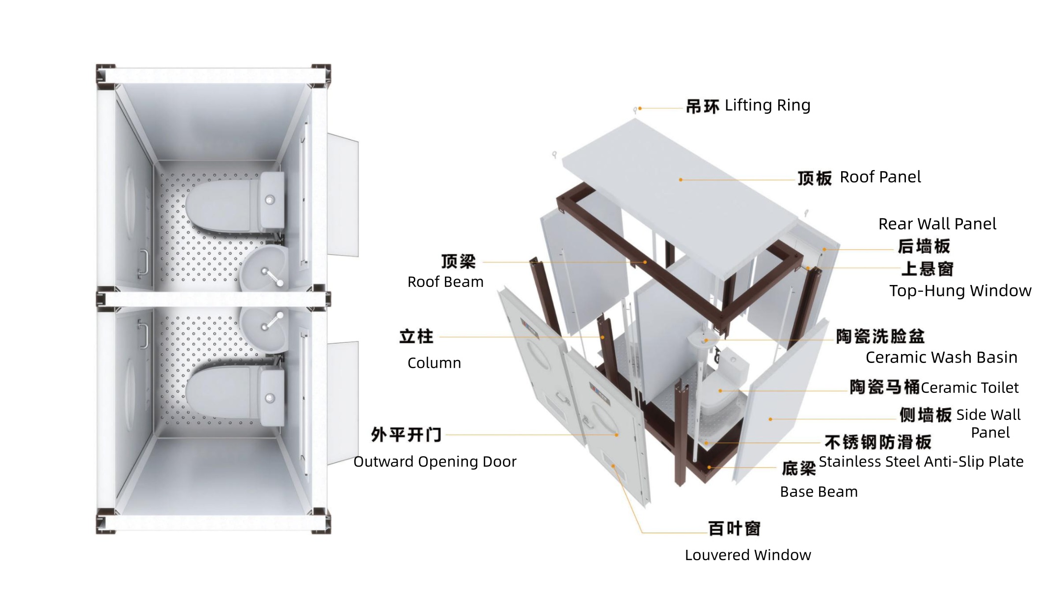 - 304 panel stainless steel (1.2 thick), ceramic toilet