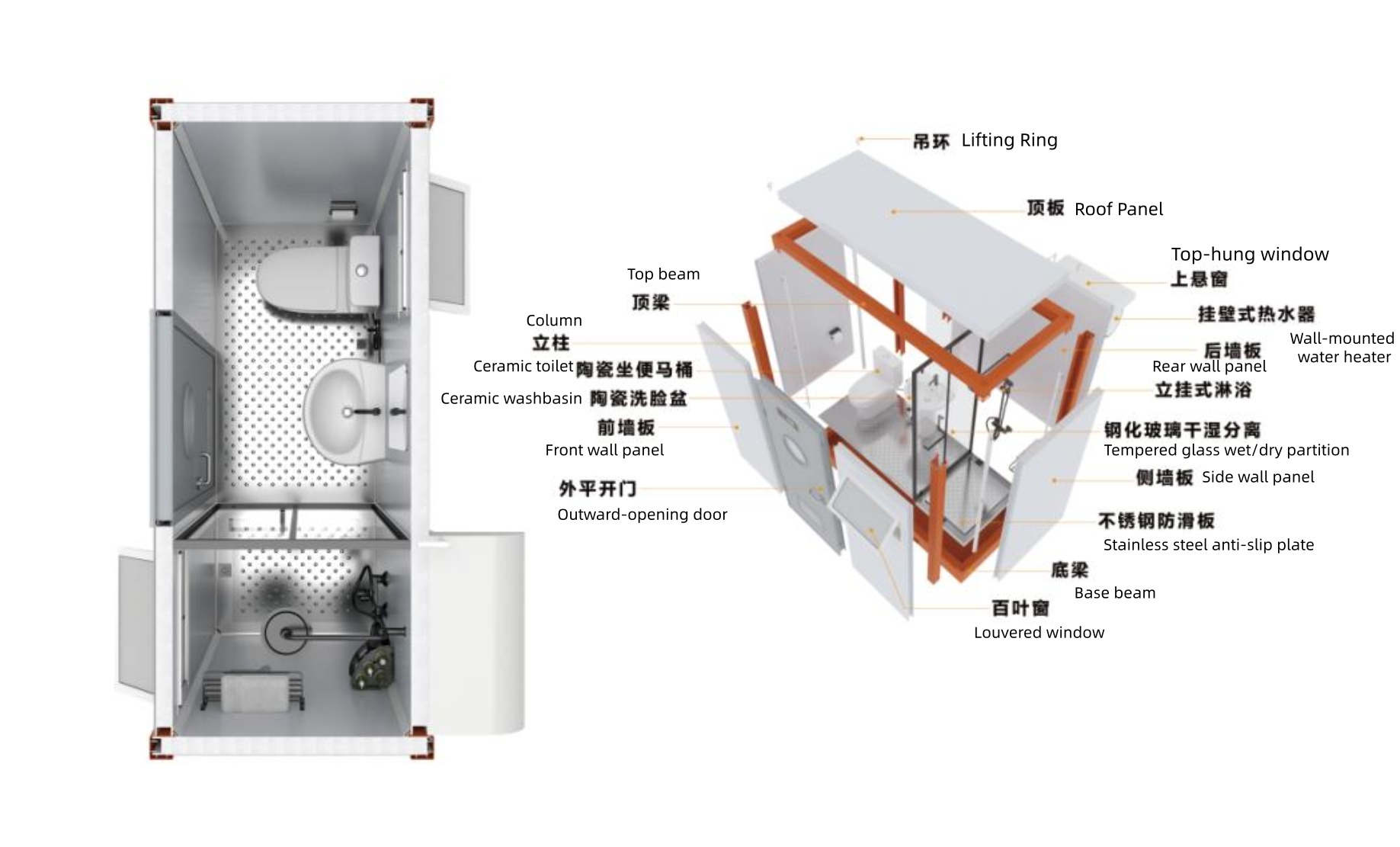 - 304 panel stainless steel (1.2 thick), ceramic toilet