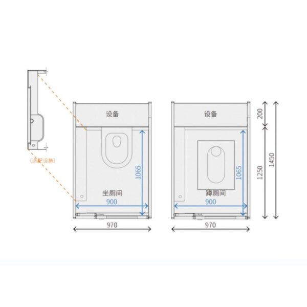 - Equipped with a vacuum sewage system. When municipal connections are available, it can be connected to water supply and drainage; when there is no municipal service, an optional external maintenance module (fresh water tank and wastewater tank) can be installed. Additional optional features include a washbasin, vanity mirror, and other auxiliary functions.