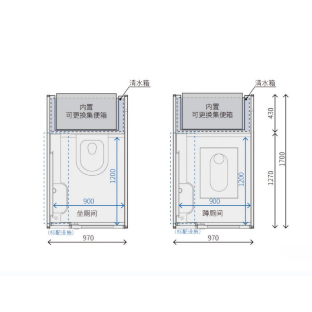 - Equipped with a water-saving toilet, requires connection to water supply and drainage